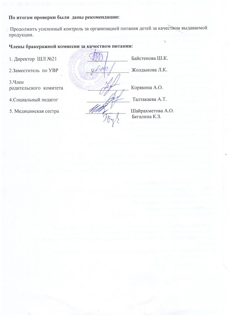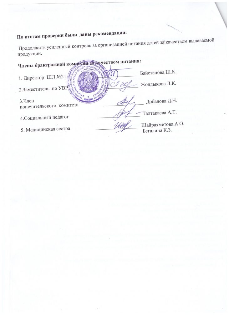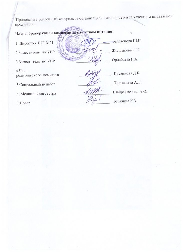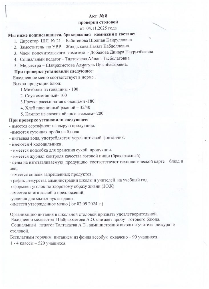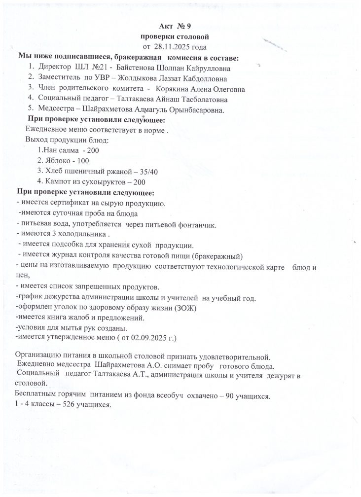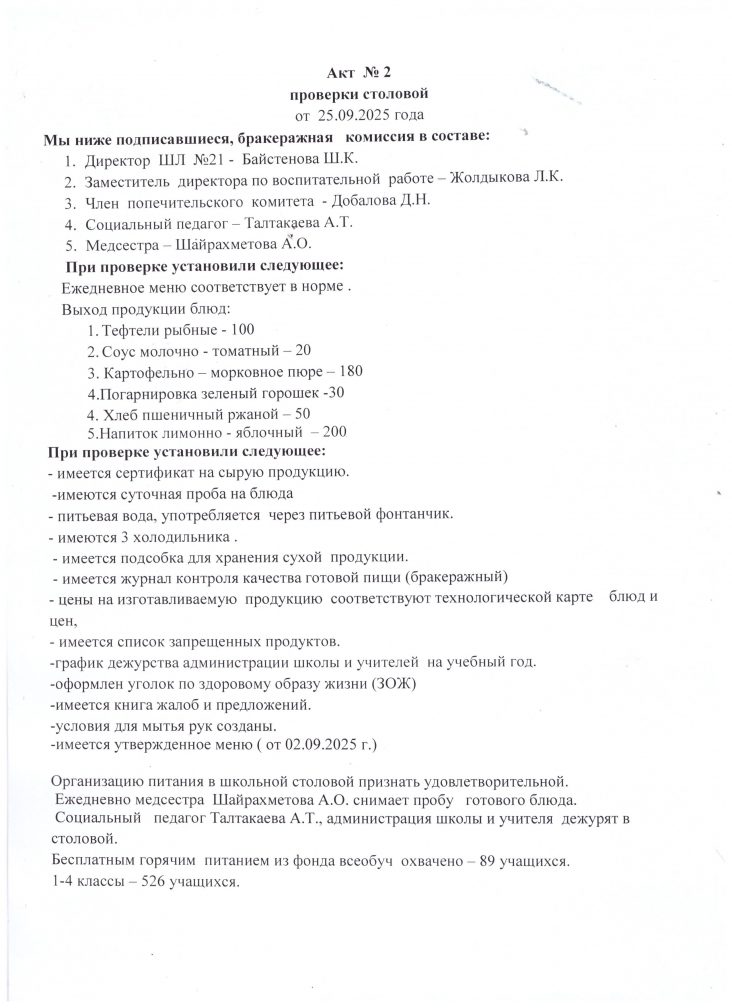 2025-2026 оқу жылы. Тамақтануды ұйымдастыруды тексеру актісі.
