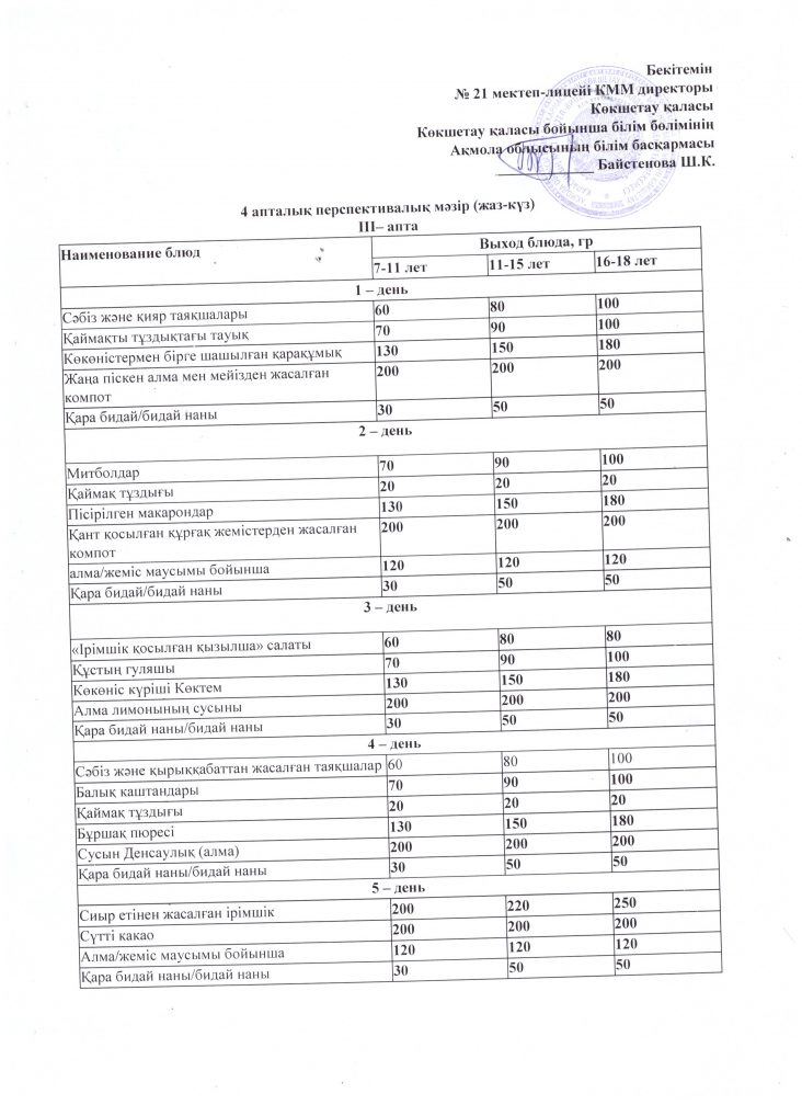 2025-2026 оқу жылы. Төрт апталық перспективалық мәзір(Жаз-Күз)