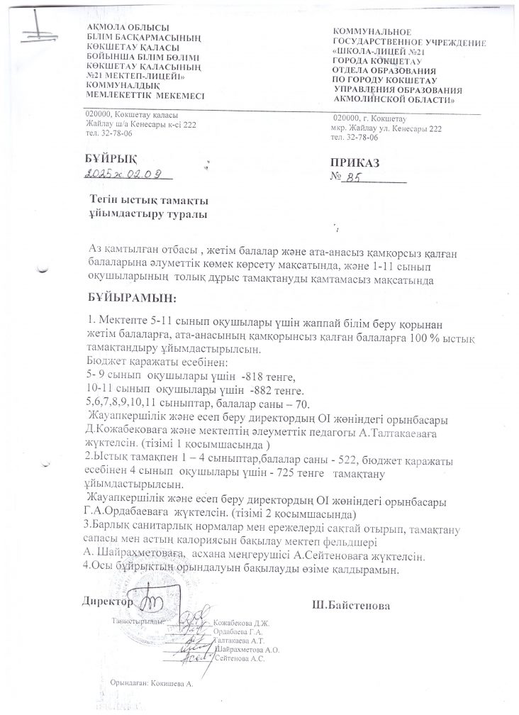 2025-2026 оқу жылы. тегін ыстық тамақты ұйымдастыру туралы бұйрық.