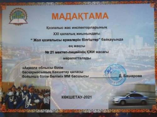 На XXI городском слете отрядов юных инспекторов движения отряд ДШИ школы-лицея №21 был награжден Дипломом III степени и ценными призами. Благодарственным письмом награждены руководитель команды Тасыгожина Баян Болатовна и член команды Аяпбергенова Аяулым. В составе команды учащиеся 5-х и 6-х классов приняли активное участие во всех конкурсах на высоком уровне. Мунгайдаров Ильяс, Сапар Айдын, Зейнулла Ислам, Болатова Алина, Душан Алмажан, Жумажан Мадияр, Аяпбергенова Аяулым, Койбагарова Томирис,Даулетбеккызы Зиба, Сатыбекова Азиза, Тореахметова Жамилия. Поздравляем!!! Молодцы!